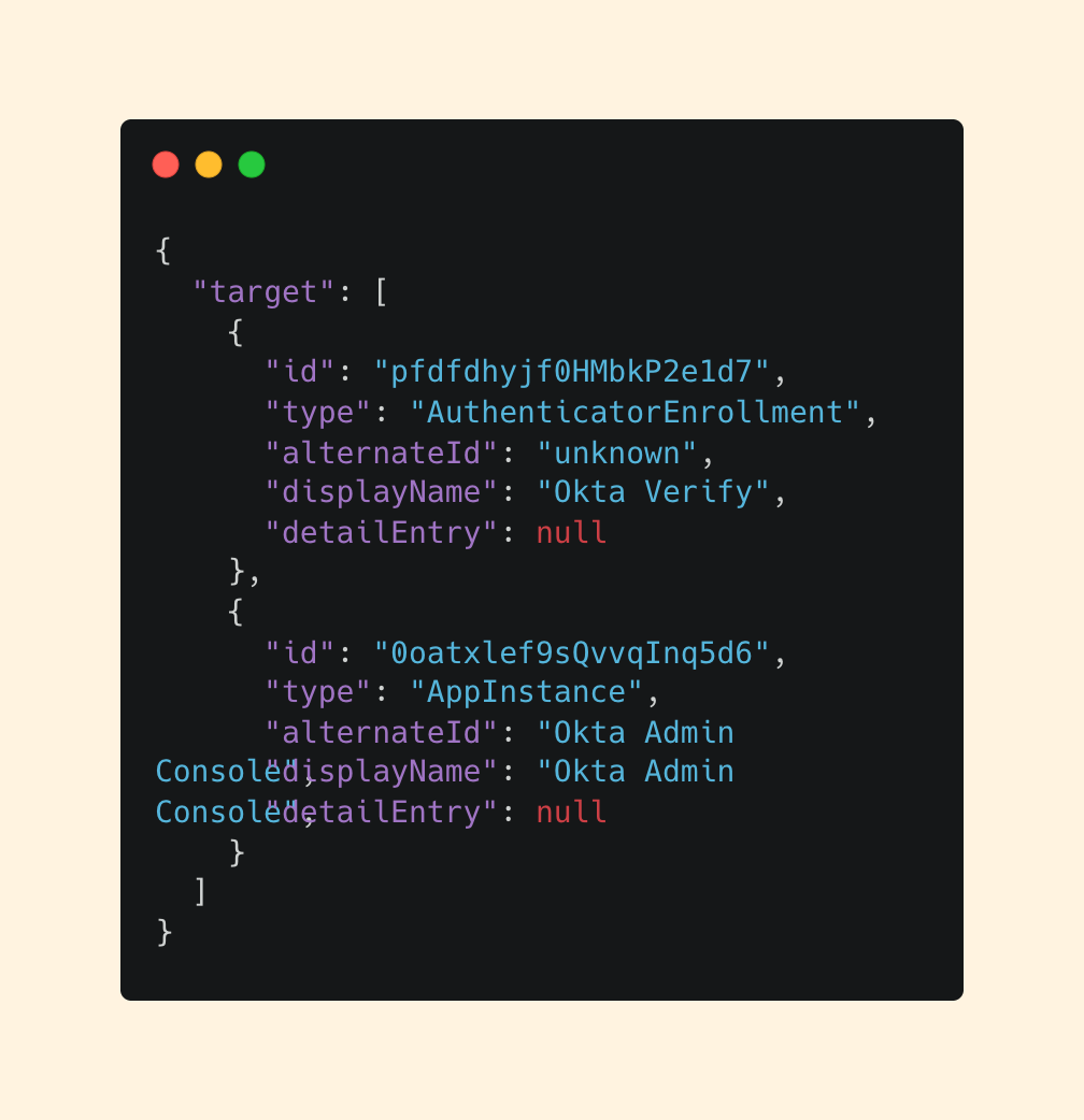 In Okta logs, the target represents the object or entity the action is being performed on. This varies based on the eventType, but in this case, we can see the action involved Okta verify in the Okta Admin Console.