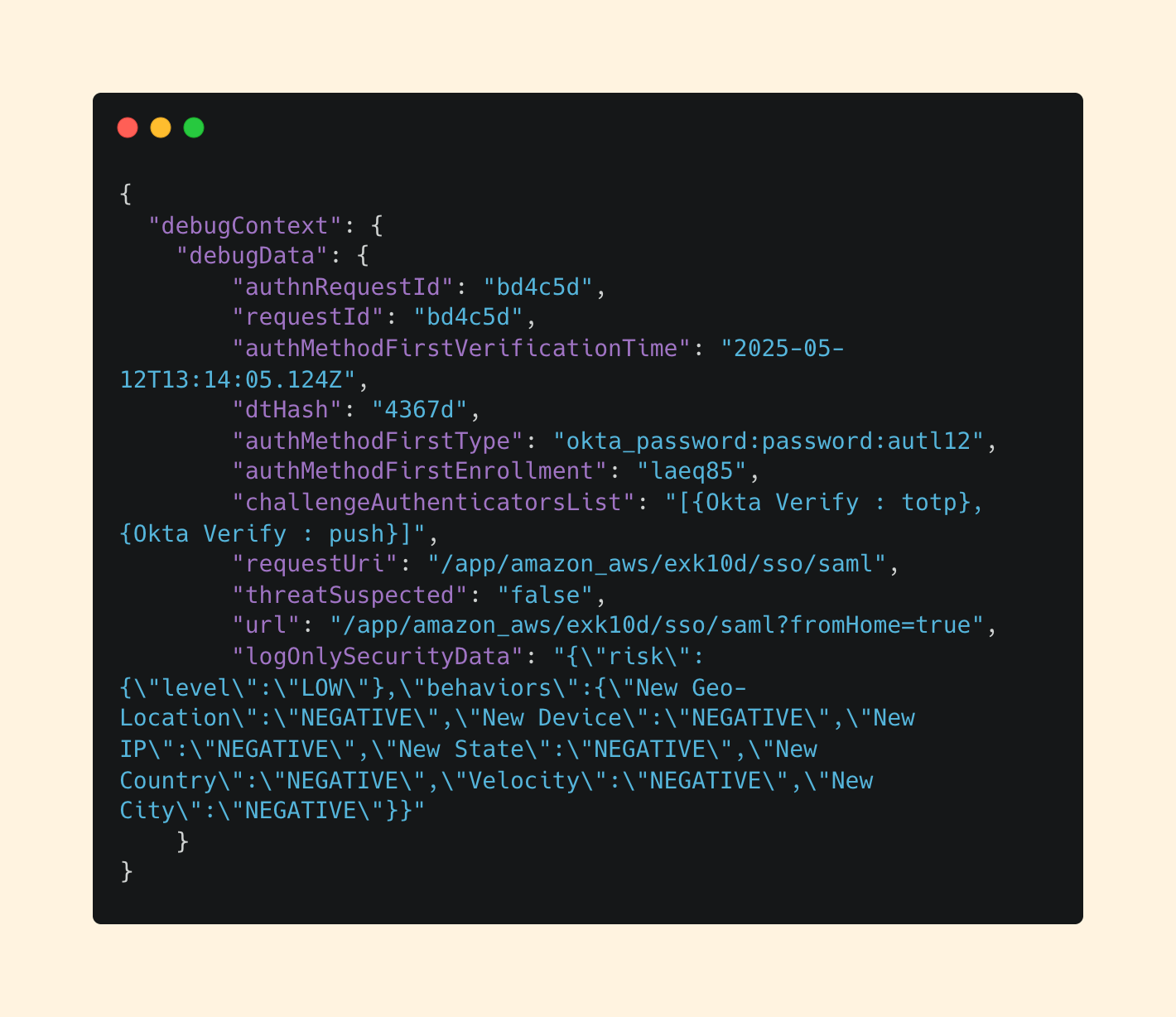 If your eyes gravitated to logOnlySecurityData, then we’re on the same page. This field contains results from a behavioral analysis using Okta’s Threat Detection engine.