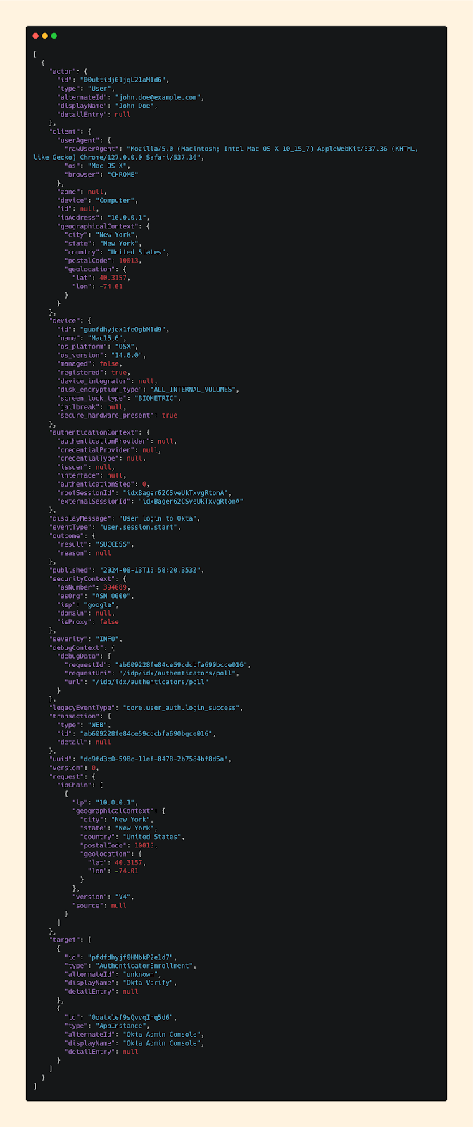 “John Doe successfully authenticated to the Okta Admin Console from an IP located in New York.”